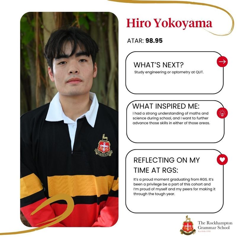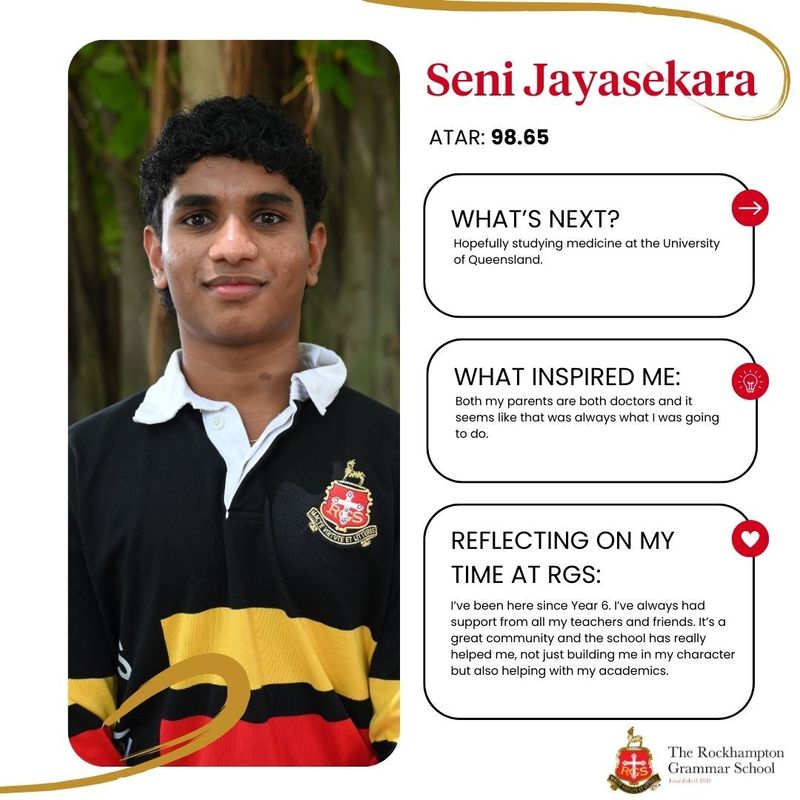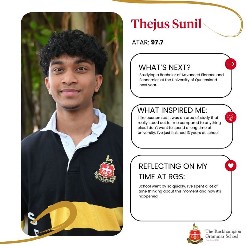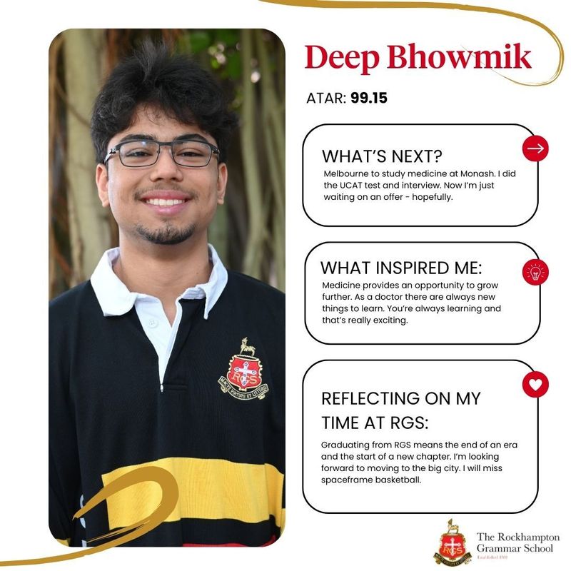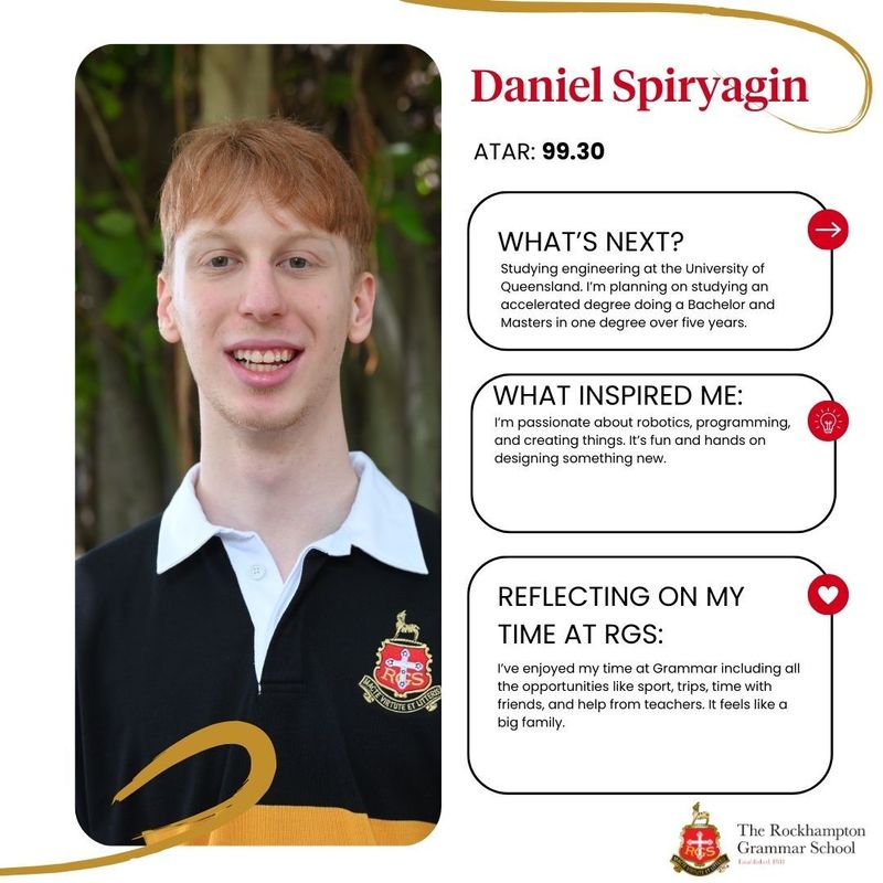RGS internal dux Daniel Spiryagin performed strongly in his subjects with his results including: Chemistry 99/100, Physics 99/100, Mathematical Methods 97/100, Specialist Mathematics 98/100, and Biology 96/100. The School’s external dux will be announced early in 2026.